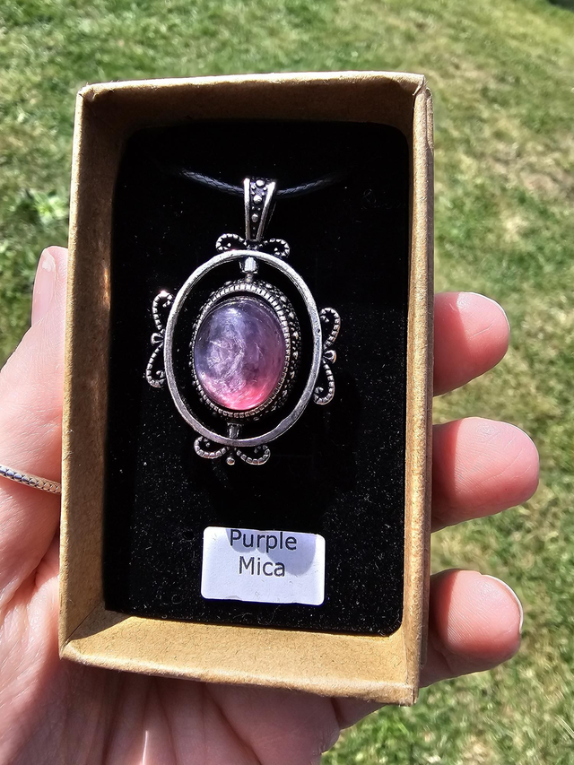 Beautiful purple mica, swivel pendant on black cord.
