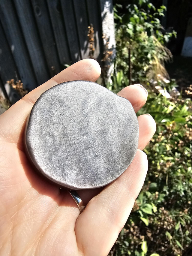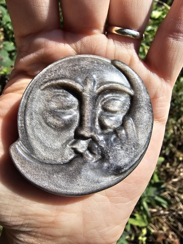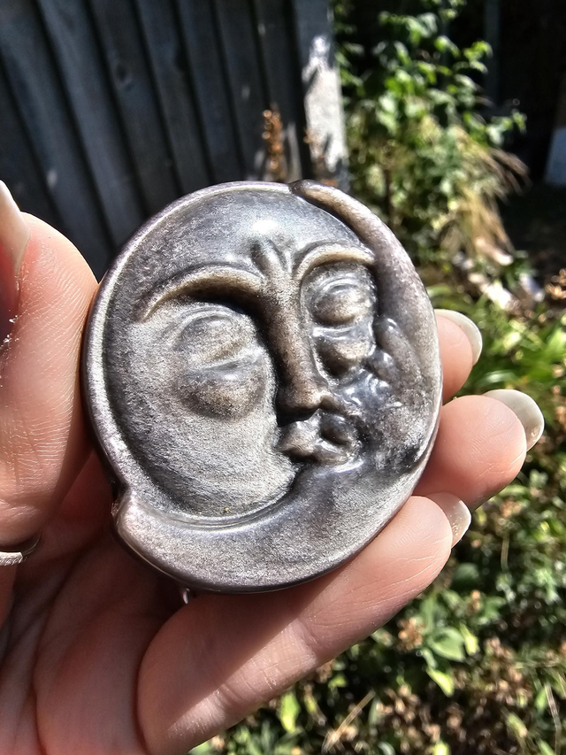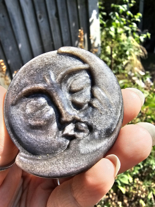 Silver Sheen Obsidian Moon/Sun carving with brilliant silver flash.
